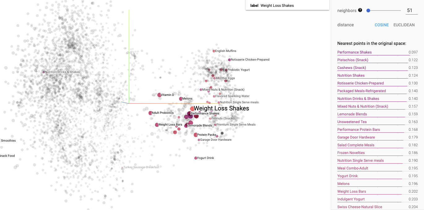 Word embedding models (e.g. word2vec) have been very successful at exploiting contextual information in large corpora. This hack explored exploiting the contextual information of which items are often bought together to build meaningful embeddings for basket items.